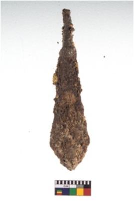 | Description / विवरण | A Complete specimen of an spearhead, with tapering pointed broken tip , It is having a tang which is circular in section and fragmentary. |