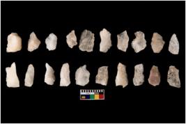| Description / विवरण | Specimen of flake tool with prominent flaking marks. It made up of a short flakes with sides trimmed. |