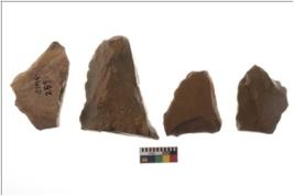 | Description / विवरण | Four worked flakes with sharp edges and few are tapering at one end. |