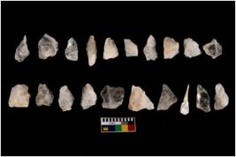 | Description / विवरण | Specimen of flake tool with prominent flaking marks. It made up of a short flakes with sides trimmed. |
