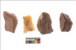 | Description / विवरण | Four worked flakes with sharp edges and few are tapering at one end. |