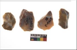 | Description / विवरण | Four worked flakes with sharp edges and few are tapering at one end. |