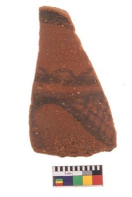 | Description / विवरण | Specimen of black on red ware with decorative geometric Groups of latticed bands formed of oblique lines and set in horizontal bands painting. |