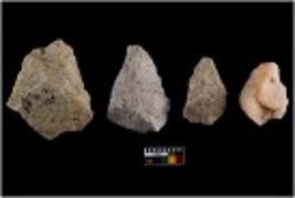 | Description / विवरण | Specimen of cores with visible weathered cortex and several broad fluted marks. All are tapering at one end. |