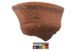 | Description / विवरण | Specimen of black on red ware with decorative geometric Its sides sloping inwards and with a featureless rim painting. |