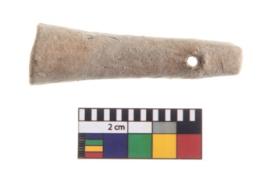 | Description / विवरण | A partially broken specimen of a Terracotta Pendant. It is made of red ware, fine fabric, well-fired. It is cylindrical in shape with tapering upwards. The hole for suspension is provided near the top. |