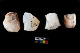 | Description / विवरण | There are n-4 of intact cores. Out of them 3 are made up Chalcedony and 1 is made up of Agate.There are multidirectional irregular dominant scar pattern on both dorsal and ventral face of the cores. |