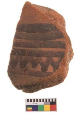 | Description / विवरण | Specimen of black on red ware with decorative geometric A row of arches over a horizontal bands painting. |