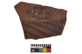 | Description / विवरण | Specimen of black on red ware with decorative geometric Net motif painting. |