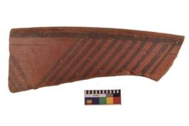 | Description / विवरण | Specimen of black on red ware with decorative geometric Its sides sloping inwards and with a featureless rim painting. |