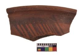| Description / विवरण | Specimen of black on red ware with decorative geometric Its sides sloping inwards and with a featureless rim painting. |