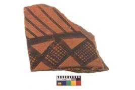 | Description / विवरण | Specimen of potsherd with black decorative geometric painting. Type Black on Red Ware . |