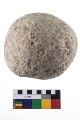 | Description / विवरण | A partially broken specimen of roughly round shaped hammer stone with battered periphery along with the circumference. |
