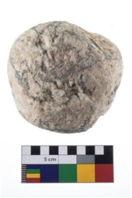 | Description / विवरण | A partially broken specimen of roughly round shaped hammer stone with battered periphery along with the circumference. |