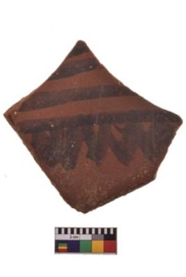 | Description / विवरण | Specimen of black on red ware with decorative geometric A row of arches over a horizontal bands painting. |