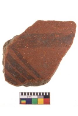 | Description / विवरण | Specimen of potsherd with black decorative geometric painting. Type Black on Red Ware . |