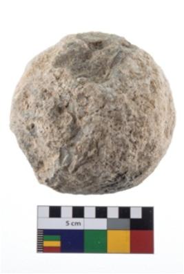 | Description / विवरण | A partially broken specimen of roughly round shaped hammer stone with battered periphery along with the circumference. |