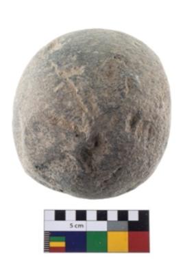 | Description / विवरण | A partially broken specimen of roughly round shaped hammer stone with battered periphery along with the circumference. |