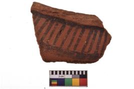 | Description / विवरण | Specimen of black on red ware with decorative geometric Vertical lines between two horizontal bands painting. |