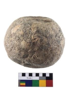 | Description / विवरण | A partially broken specimen of roughly round shaped hammer stone with battered periphery along with the circumference. |