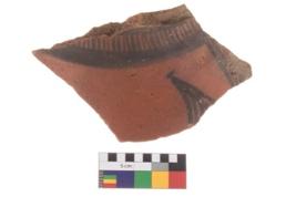 | Description / विवरण | Specimen of a potsherd with black decorative geometric painting on it. It has group of oblique lines set two horizontal bands. |