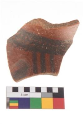 | Description / विवरण | Specimen of a potsherd with black decorative geometric painting on it.It is set of two zigzag bands. |