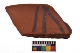 | Description / विवरण | Specimen of black on red ware with decorative geometric Two sets of two oblique bands in opposite direction painting. |
