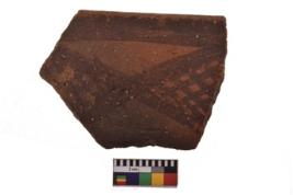 | Description / विवरण | Specimen of black on red ware with decorative geometric A row of latticed diamonds set in horizantal bands but having groups of oblique lines at intervals painting. |