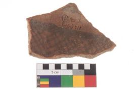 | Description / विवरण | Specimen of a potsherd with black decorative geometric painting on it. It has group of oblique lines set two horizontal bands |