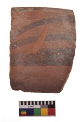 | Description / विवरण | Specimen of black on red ware with decorative geometric Its decorated with two horizontal bands with sets of triple arches painting. |