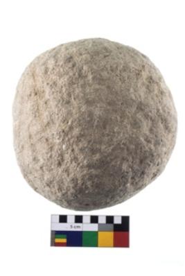 | Description / विवरण | A partially broken specimen of roughly round shaped hammer stone with battered periphery along with the circumference. |