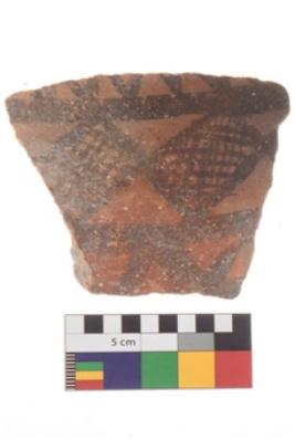 | Description / विवरण | Specimen of potsherd with black decorative geometric diamond set broad horizontal bands painting . |