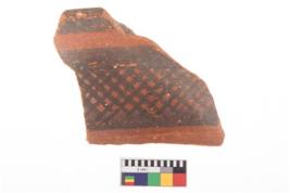 | Description / विवरण | Specimen of potsherd with black decorative geometric Net Pattern painting . |