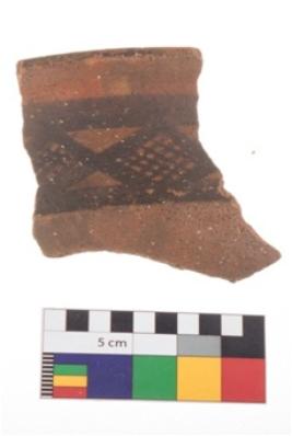| Description / विवरण | Specimen of potsherd with black decorative geometric diamond set broad horizontal bands painting . |