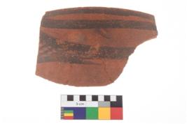 | Description / विवरण | Specimen of a potsherd with black decorative geometric painting on it. It has group of oblique lines set two horizontal bands. |