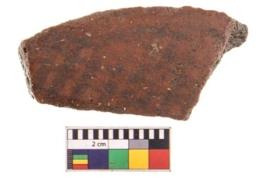 | Description / विवरण | Specimen of black on red ware with decorative geometric Two horizontal bands containing criss-cross pattern painting. |