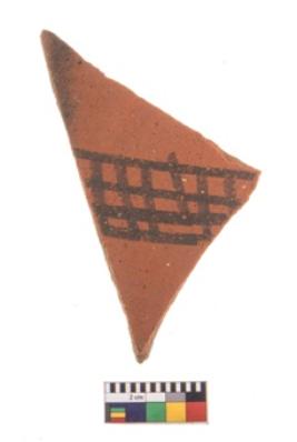| Description / विवरण | Specimen of potsherd with black decorative geometric painting. Type Black on Red Ware . |