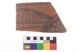 | Description / विवरण | Specimen of a potsherd with black decorative geometric painting on it. It has group of oblique lines set two horizontal bands. |