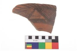 | Description / विवरण | Specimen of a potsherd with black decorative geometric painting on it. It has group of oblique lines set two horizontal bands. |