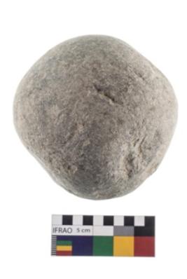 | Description / विवरण | A partially broken specimen of roughly round shaped hammer stone with battered periphery along with the circumference. |