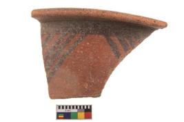 | Description / विवरण | Specimen of black on red ware with decorative geometric Groups of oblique strokes set in horizontal bands on the exterior painting. |