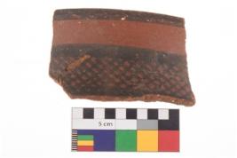 | Description / विवरण | Specimen of potsherd with black decorative geometric Net Pattern painting . |