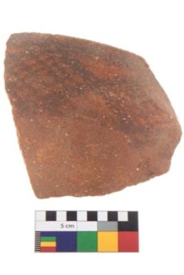| Description / विवरण | Specimen of potsherd with black decorative geometric diamond set broad horizontal bands painting . |