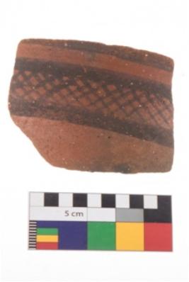 | Description / विवरण | Specimen of potsherd with black decorative geometric Net Pattern painting . |