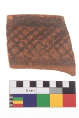 | Description / विवरण | Specimen of potsherd with black decorative geometric Net Pattern painting . |