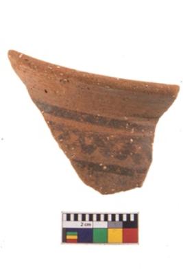 | Description / विवरण | Specimen of black on red ware with decorative geometric A row of arches over a horizontal band painting. |