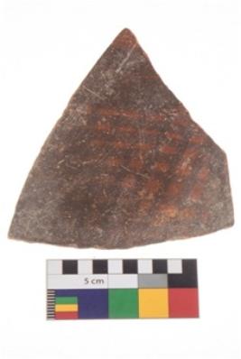 | Description / विवरण | Specimen of potsherd with black decorative geometric Net Pattern painting . |