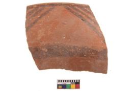 | Description / विवरण | Specimen of black on red ware with decorative geometric Groups of oblique strokes set in horizontal bands on the exterior painting. |