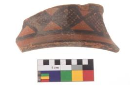 | Description / विवरण | Specimen of potsherd with black decorative geometric diamond set broad horizontal bands painting . |