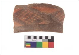 | Description / विवरण | Specimen of potsherd with black decorative geometric diamond set broad horizontal bands painting . |